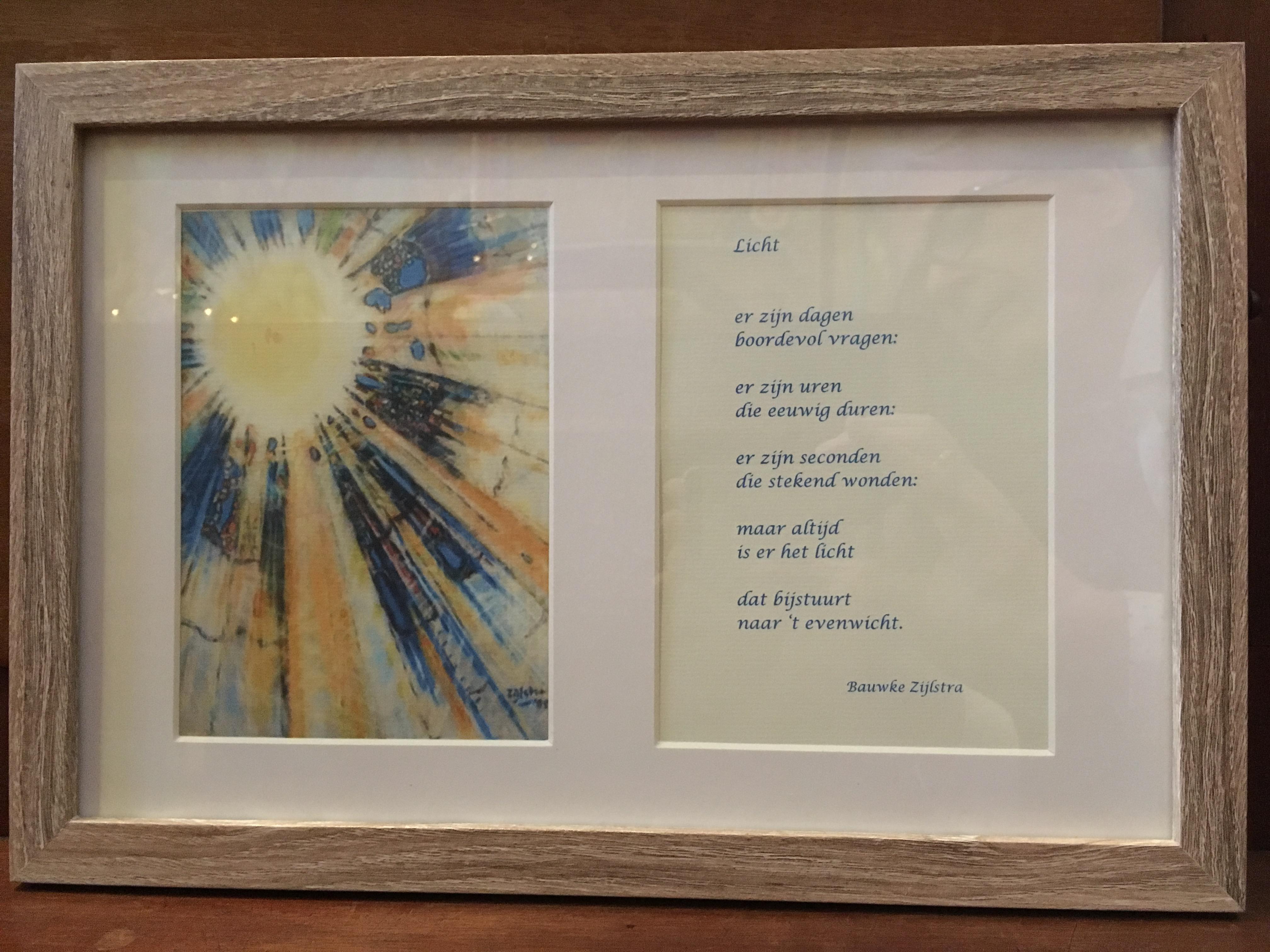 Een week eerder speelde Emöke Tavassy, een van onze sopranen, in de Messiaskerk in Wassenaar. Ook dat kerkgebouw is een feest van licht. Het pianospel was ter gelegenheid van de opening van de expositie van Bauwke Zijlstra. Als dank kreeg Emöke dit kunstwerk mee. De tentoonstelling is nog te bezichtigen op 1 en 8 juni van 15 tot 17 uur.